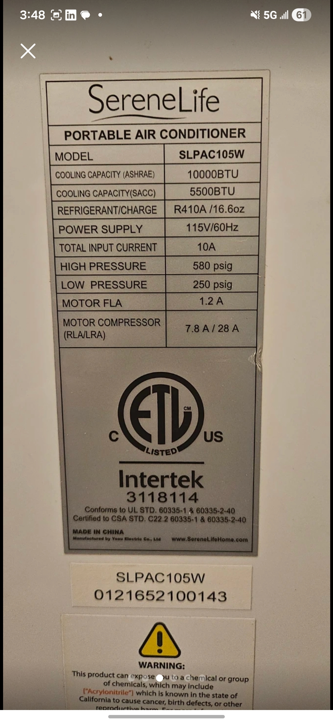 This is a SereneLife SLPAC105W portable air conditioner with a cooling capacity of 10000 BTU. It's white and has multiple settings including cool, fan (...)