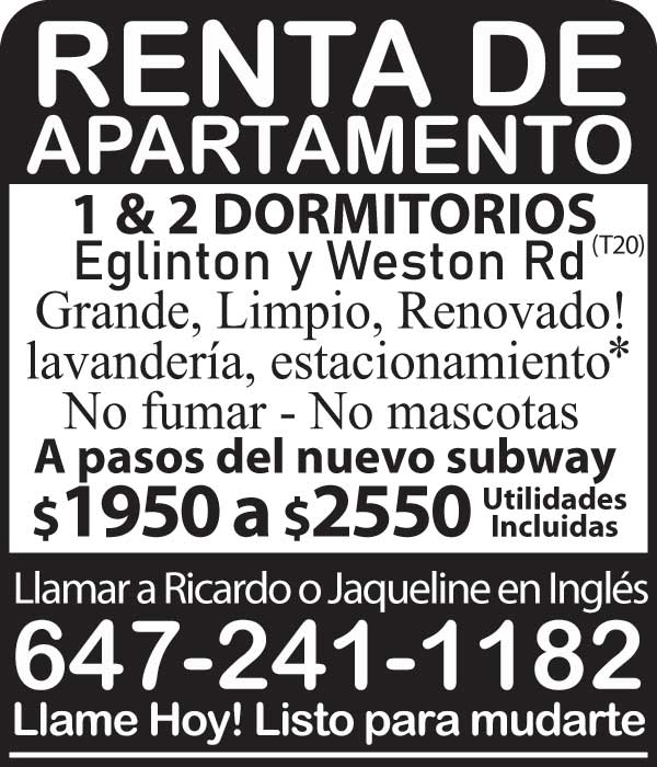 Rento Apartamento en Toronto, 2 Piso, estacionamiento y lavandería extra, Area: Jane y Black Creek, Disponible de Inmediato. $1775 Utilidades Incluid (...)